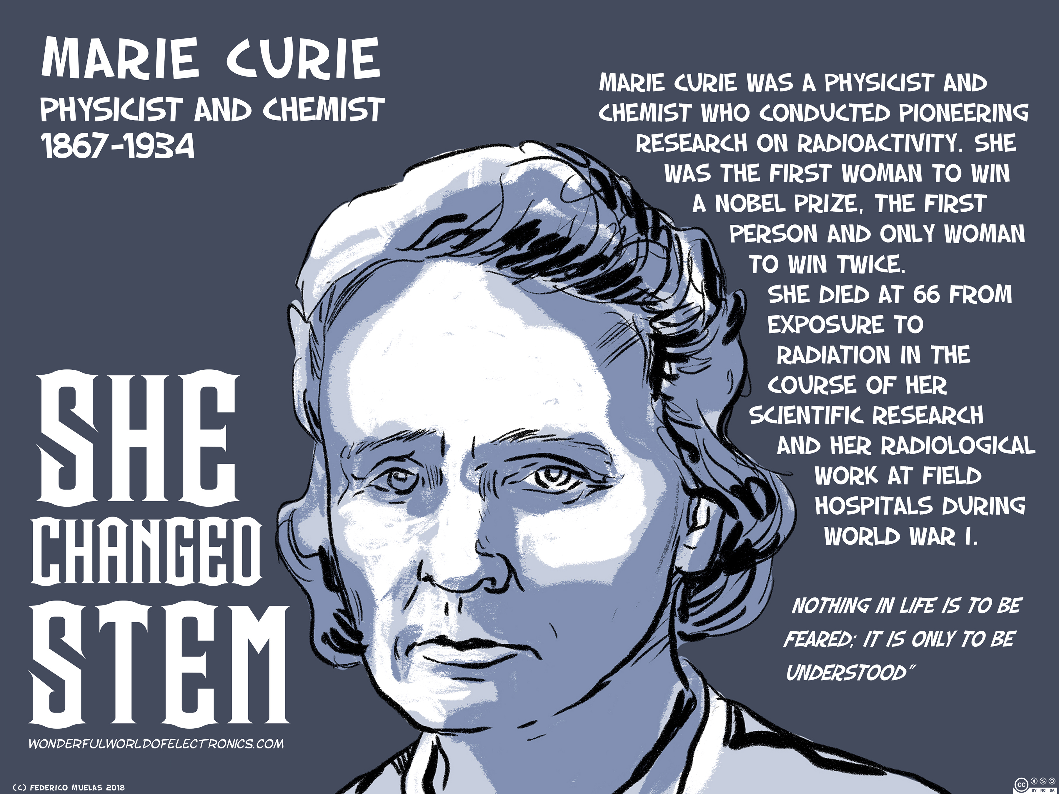 - La física y químicaMarie Curie (1867-1934), pionera en el campo de la radiactividad, que fue la primera persona en recibir dos Premios Nobel en distintas especialidades –Física (en 1903, compartido con Antoine Henri Becquerel y Pierre Curie) y Química (en 1911)– y la primera mujer en ser profesora en la Universidad de París.
