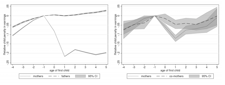 Con el fin de cuantificar la importancia de estos factores, en un reciente trabajo, Emily Nix y Martin Eckho Andresen examinan un grupo de control muy interesante: qué ocurre con las mujeres que tienen un hijo pero cuya pareja, en lugar de ser un hombre, es una mujer. ¿Se resiente su carrera profesional de la misma manera que en el caso de las madres heterosexuales? ¿Y qué ocurre con la carrera de sus parejas?