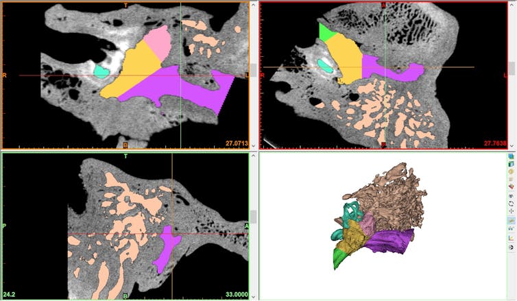 El diagnóstico se basaba en una imagen tomográfica que mostraba la obliteración de los conductos auditivos de Agamenón. Desde entonces, las técnicas tomográficas han experimentado un extraordinario progreso y ahora es posible obtener imágenes de mucha mayor precisión. Con un software específico podemos reconstruir en tres dimensiones las cavidades del oído a partir de cientos de tomografías computarizadas. Son avances técnicos que no existían en 1997. Por otra parte, en las dos últimas décadas, nuestro equipo ha desarrollado una técnica que permite establecer la transmisión de la energía sonora a través del oído externo y medio a partir de la medición de sus dimensiones obtenida en los modelos tridimensionales.