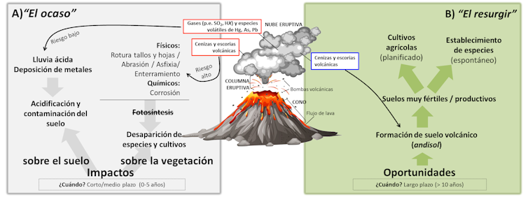 A pesar de que las plantas desaparecen, los terrenos hoy cubiertos de cenizas en las faldas del volcán se volverán fértiles y productivos a largo plazo, haciendo posible que la vida regrese, con más vigor si cabe, a la perla verde del archipiélago canario (figura 1B).