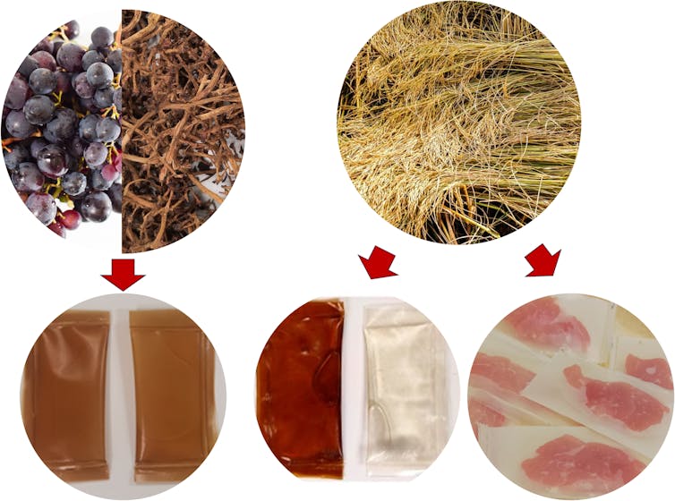 Bolsas monodosis compostables fabricadas con residuos vinícolas y de la piel de la almendra que evitan la oxidación del aceite de girasol o envases a partir de la paja de arroz con propiedades antibacterianas para conservar filetes de carne.