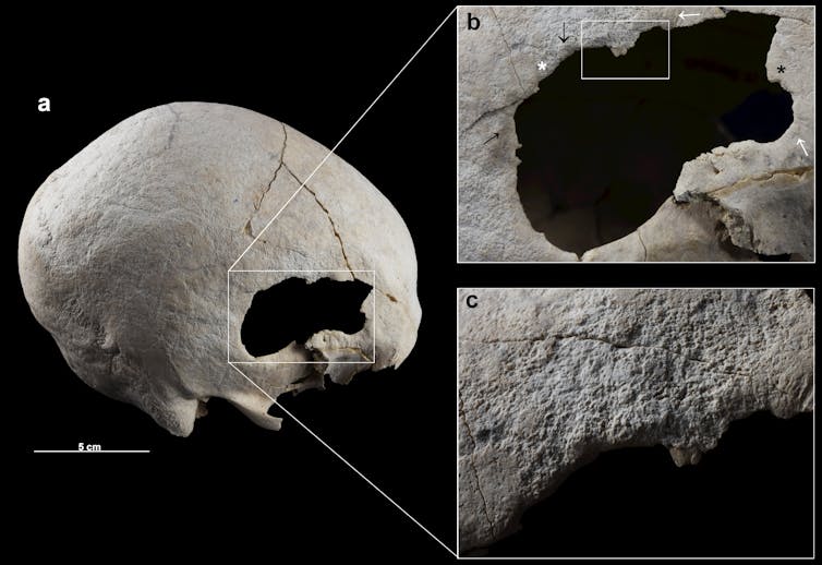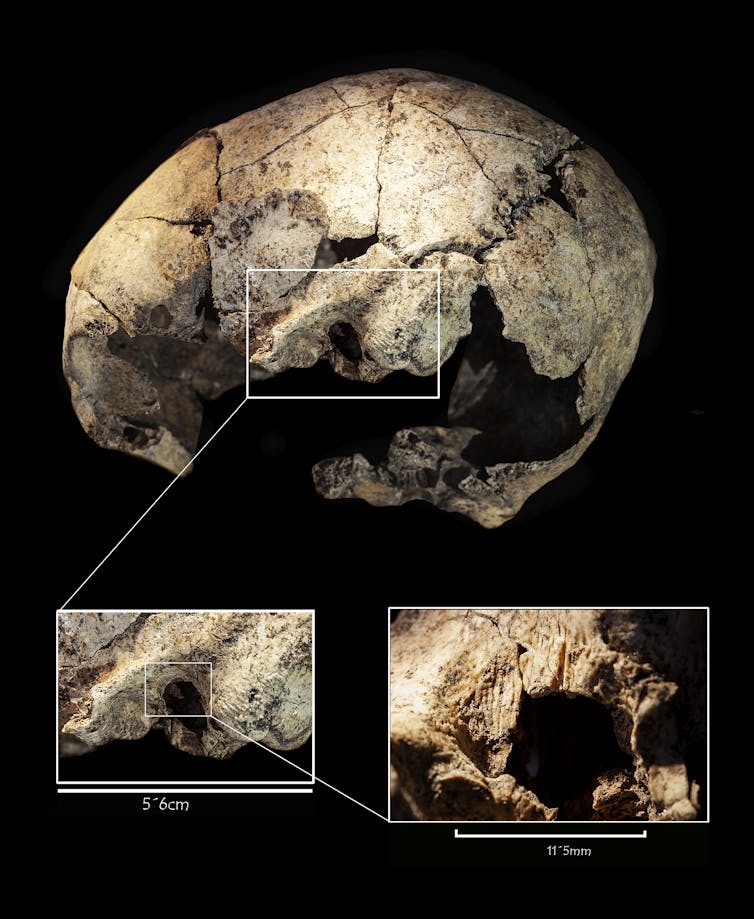 Esta práctica se puede definir como una mastoidectomía, un procedimiento quirúrgico que se sigue realizando y que posiblemente sirvió para aliviar el dolor que esta mujer sufrió como consecuencia de una otitis y una mastoiditis (infección en el hueso posterior al oído). La regeneración que se observa en ambos oídos demuestra que la paciente sobrevivió a ambas intervenciones.