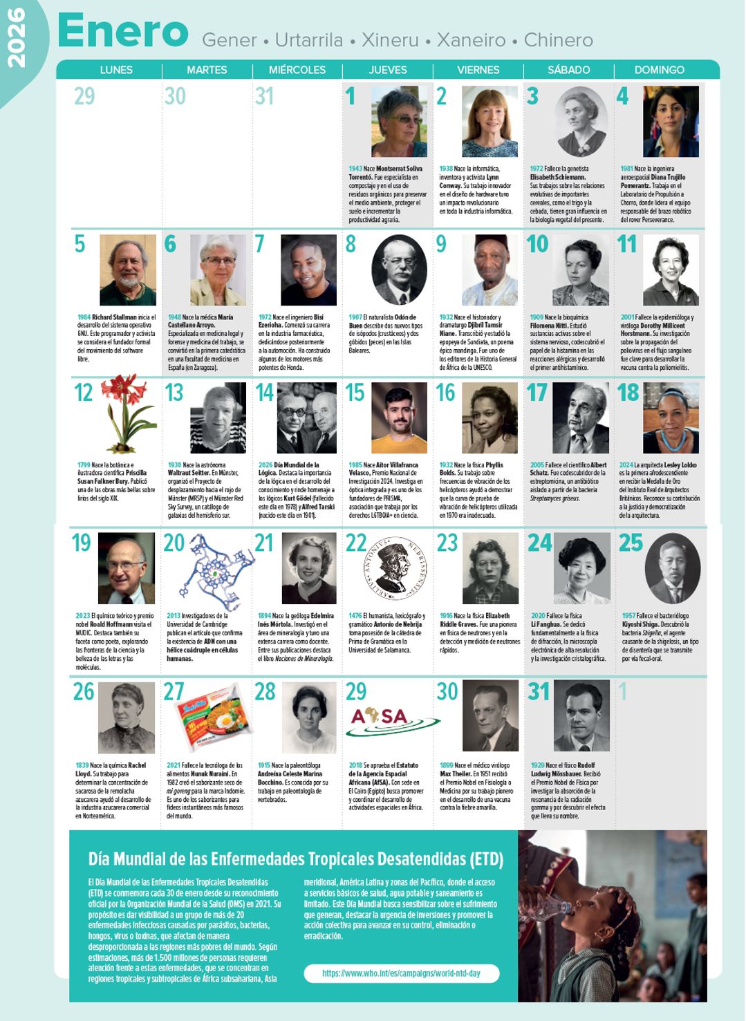 Dirigido al alumnado de educación primaria y secundaria obligatoria, este calendario incluye cada día un aniversario relacionado con la ciencia o la tecnología. Puede tratarse de la celebración del nacimiento de una científica o un científico, o la conmemoración de algún logro científico notable.